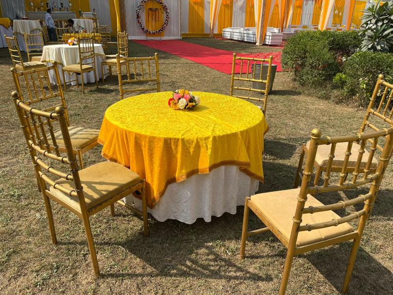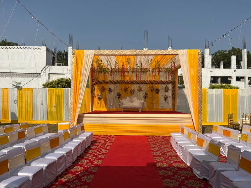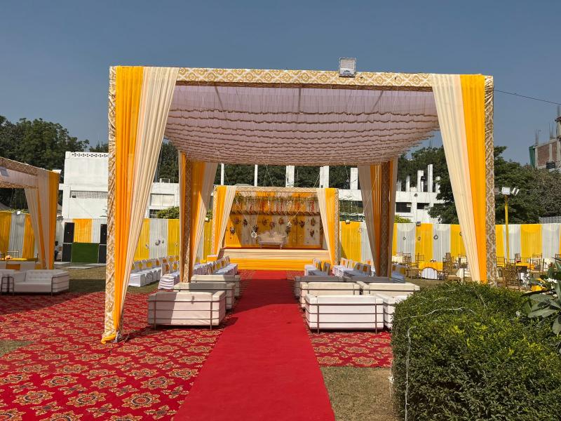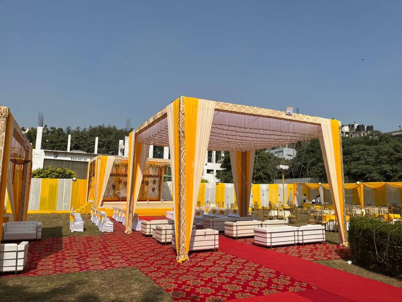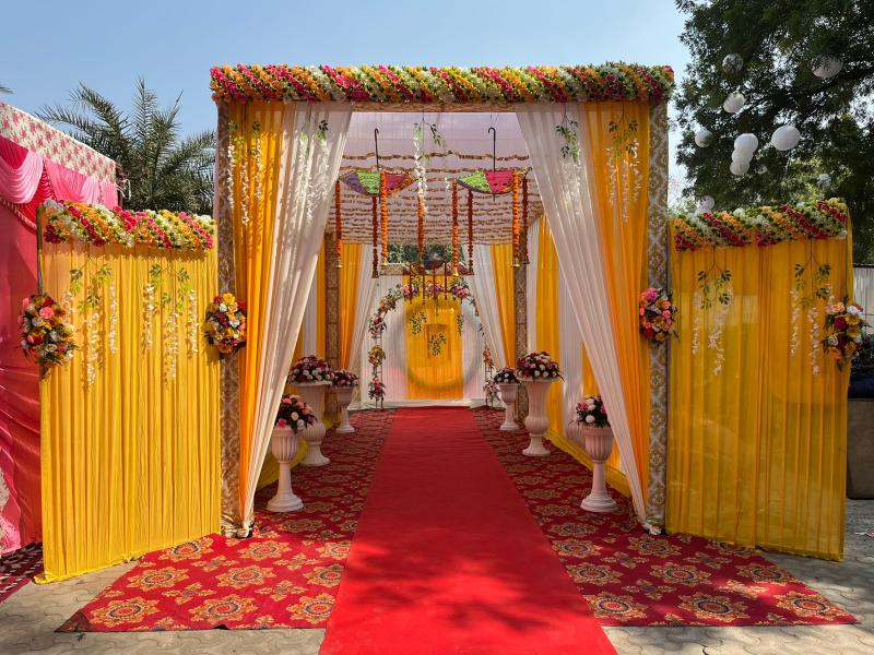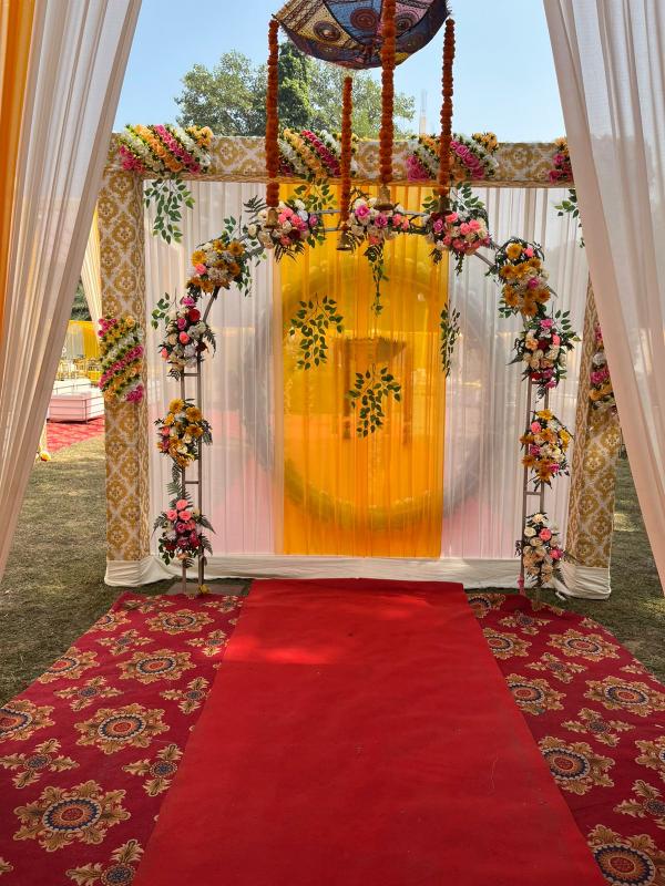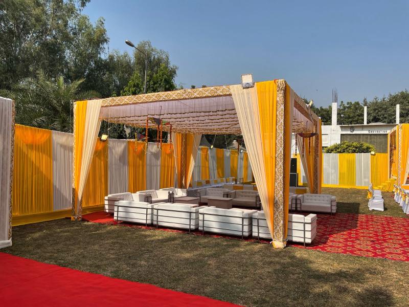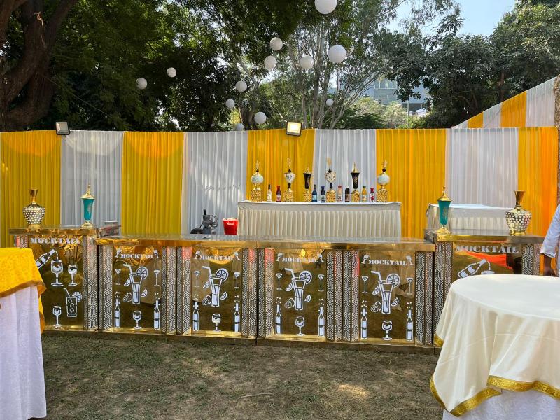 To enhance the theme, the tent decorators strategically place themed props and decorative elements throughout the space. These can include ornate Rajasthani artwork, traditional Indian motifs such as peacock feathers or lotus flowers, Bollywood-inspired elements like movie posters or film reels, or regal accents like elephant statues or palace-inspired archways.