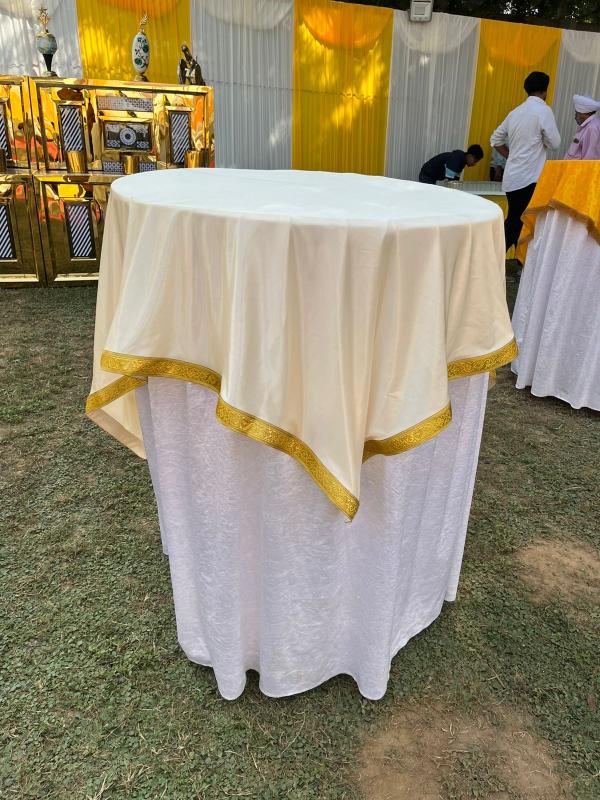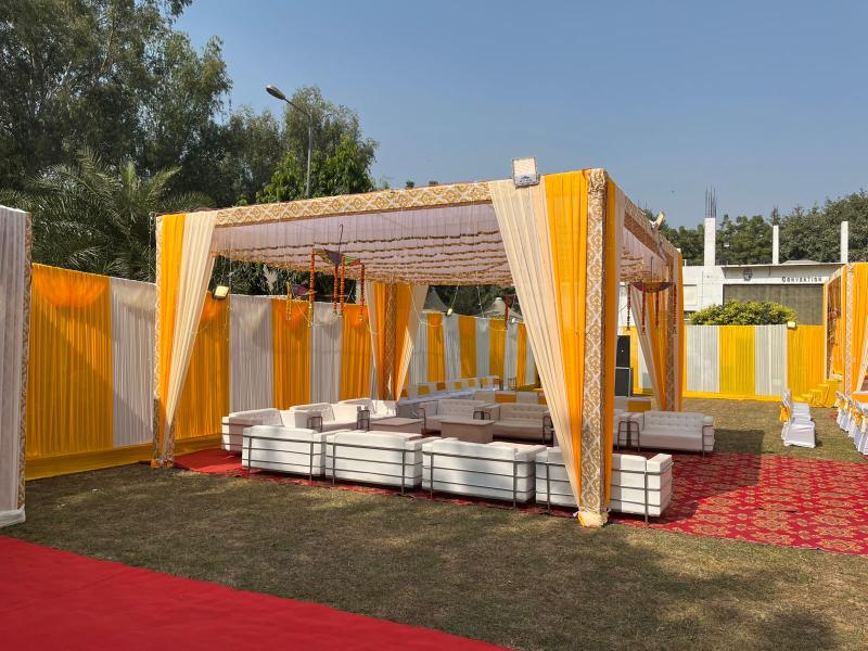 The theme decor begins with the draping of the tent's interior. Luxurious fabrics in vibrant colors or rich jewel tones are used to create an opulent and visually striking backdrop. These drapes can be embellished with intricate embroidery, sequins, or mirror work to add a touch of traditional Indian craftsmanship.